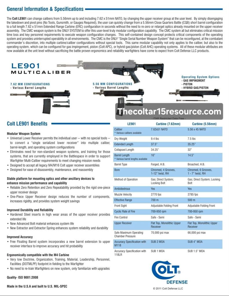 The Colt LE901 design enabled the use of both calibers by the end-user by changing upper receiver assemblies. The two images that are attached in this post are from a 2011 marketing sheet promoting the LE901 and it’s multi-caliber capability.