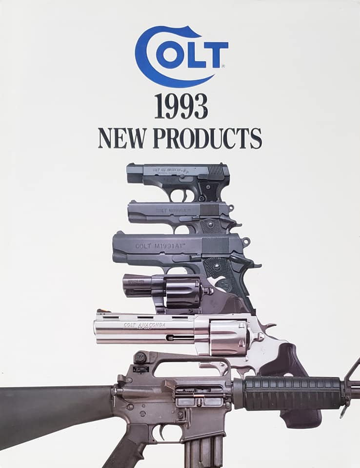This Colt tri-fold from 1993 showcased 5 new firearms (Colt Detective Special, R6530 7.62×39 Sporter Lightweight Rifle, Colt Anaconda, M1991A1 Compact, M1991A1 Commander)and the Colt 2000 barrel/bushing kit.