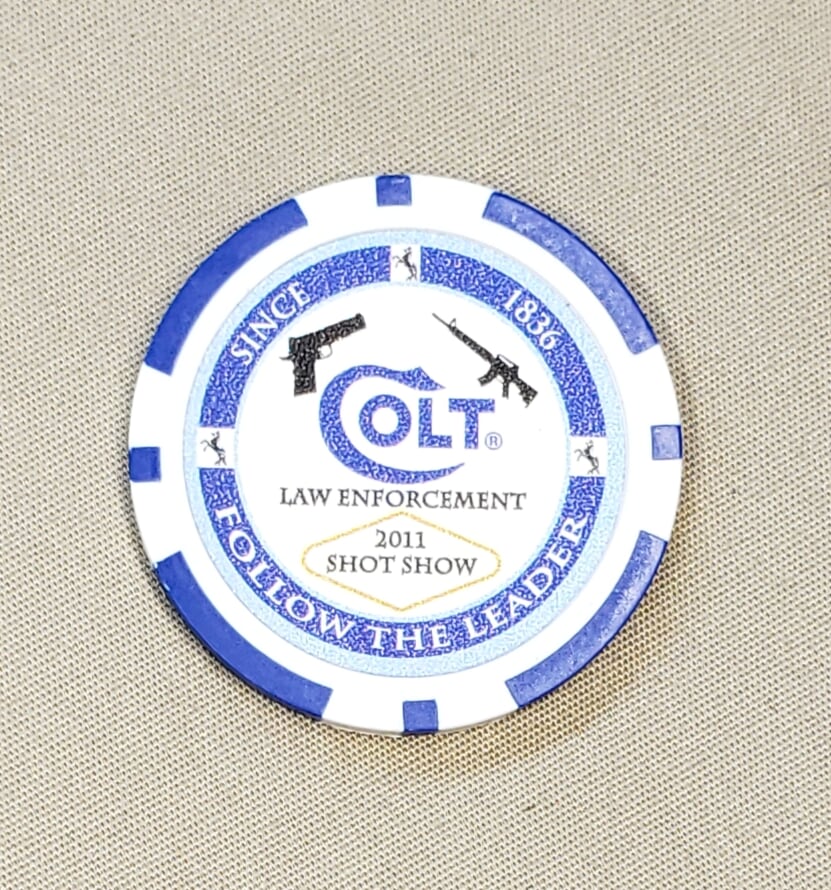 Colt poker chip from the 2011 Shot Show. The chip promoted Colt’s Law Enforcement product division on the front and promoted the LE901 Multicaliber capable rifle on the back.