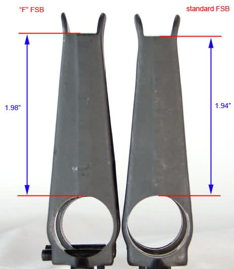 At one time Colt was producing flat top (picatinny rail on the top of the upper receiver for a detachable carry handle, optics, etc.) AR’s and AR’s with fixed carry handles at the same time. The specifications for a front sight base for a flat top rifle is different from a front sight base that is put on a rifle with a fixed carry handle. See illustration below. There is a .04 inch height difference. In order for the proper front sight base to get put on the correct rifles, Colt was marking front sight bases for flat top rifles with an ‘F’.