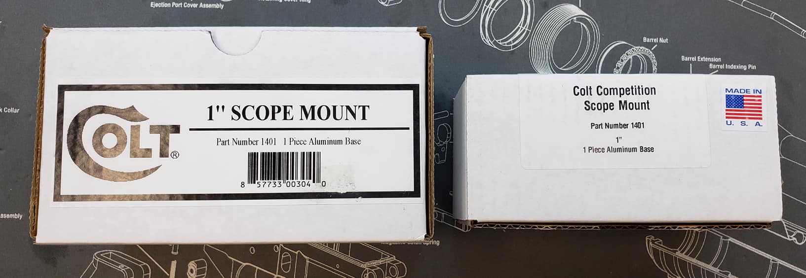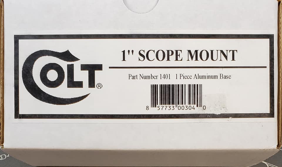 I went in my local gun shop today. They had a second variation of the ‘Colt’ 1-inch scope ring mount in stock. The first variation that I had seen and purchased previously was marketed under the Colt Competition line as part # 1401. The variation that I found today was also part # 1401 but it was marketed as a ‘Colt’ product and not ‘Colt Competition’. Both items are rebranded Warne scope mounts.