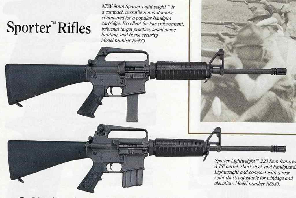 This Colt 1992 catalog photo shows the Colt CS (marking barely visible)stock variation installed on the Colt R6530 Sporter Lightweight (.223 and new in 1991) and the Colt R6430 Sporter Lightweight (9mm and new in 1992). History and some technical data coming soon.