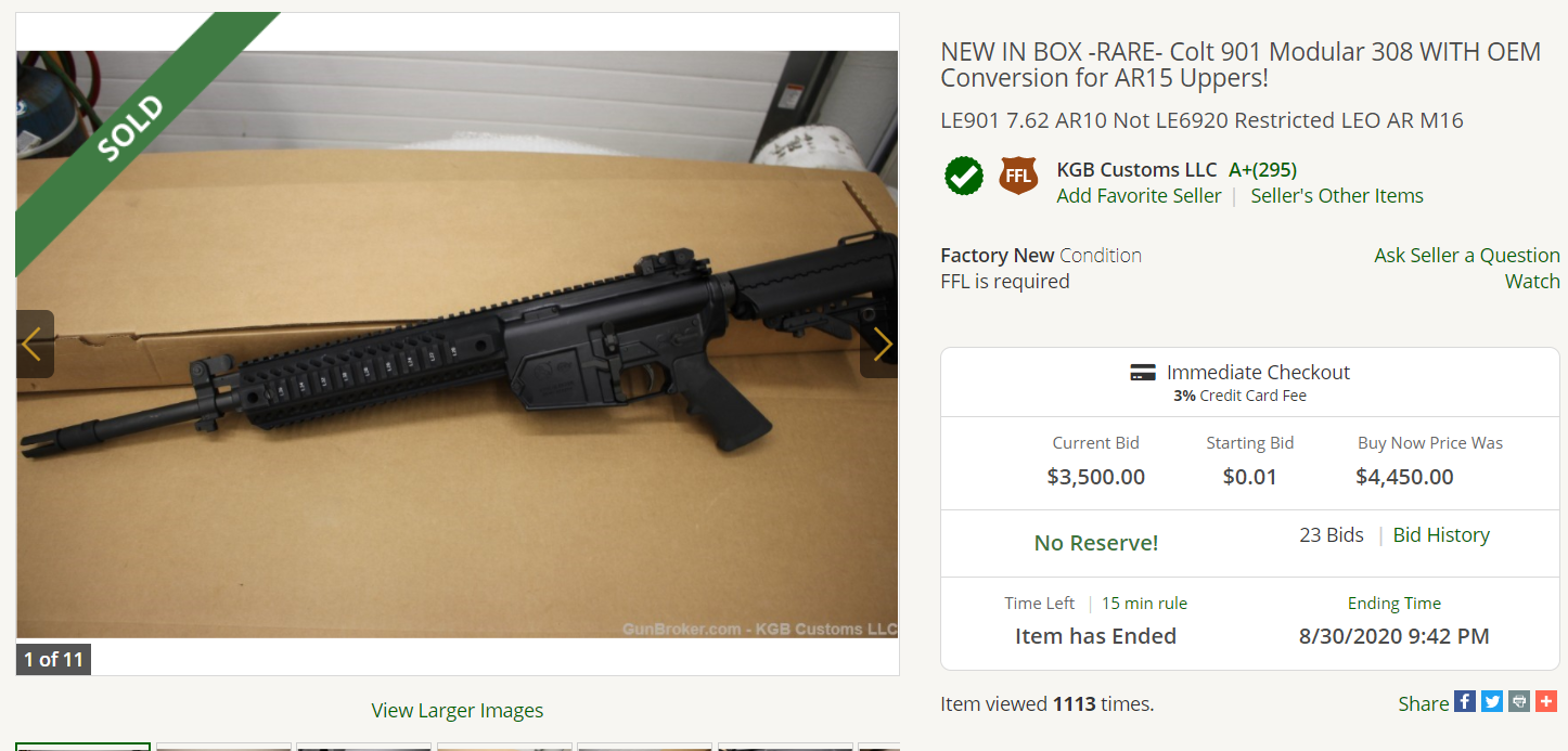 Lastly, one of the unexpected high performers of the ‘Coltpocalypse/Covid’ period has been the Colt LE901. Ashamedly, I passed on a M.A.R.C. 901 at $1499.00 right before the Coltpocalypse early in the year because I had my eyes on another Colt rifle at the time. At the end of August, this example sold for $3500.00.