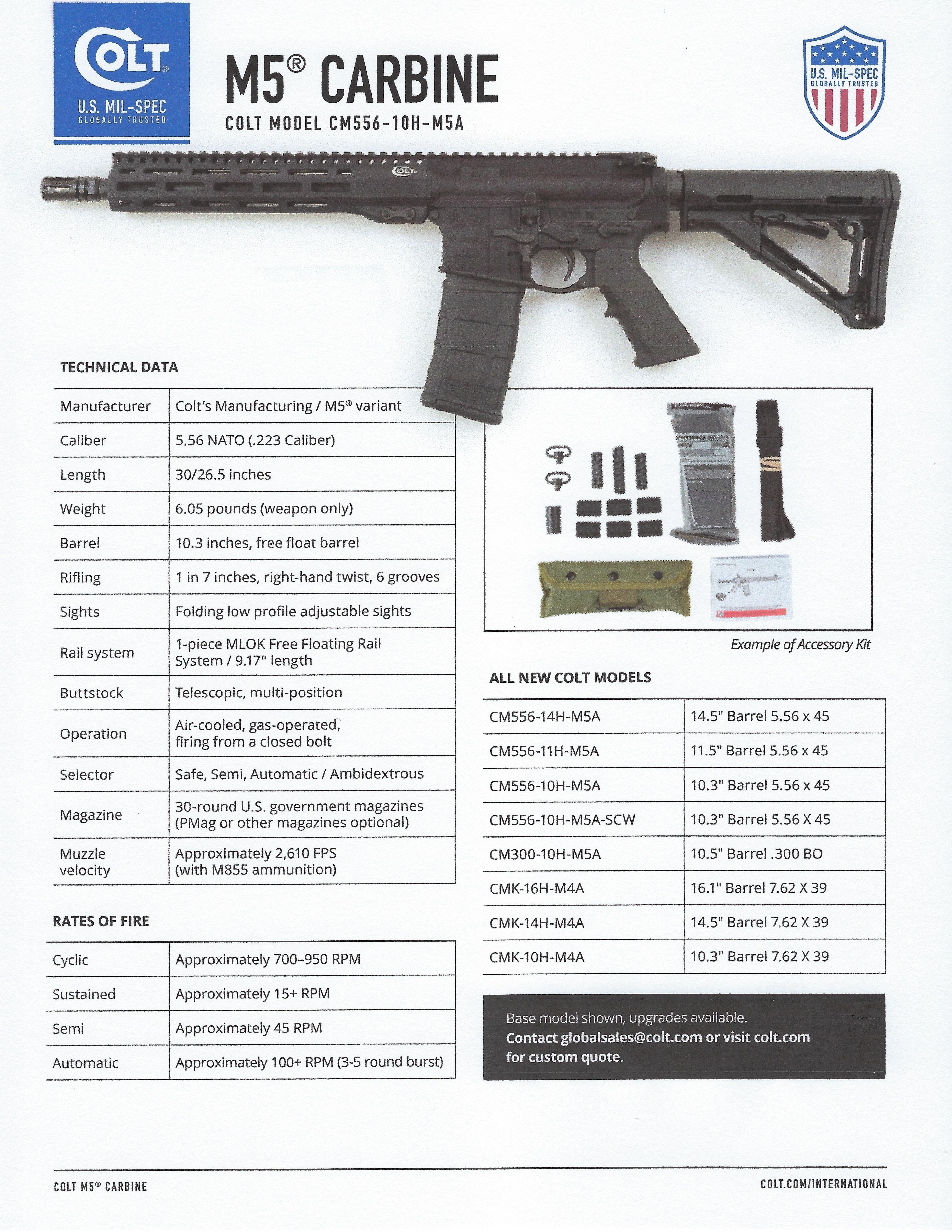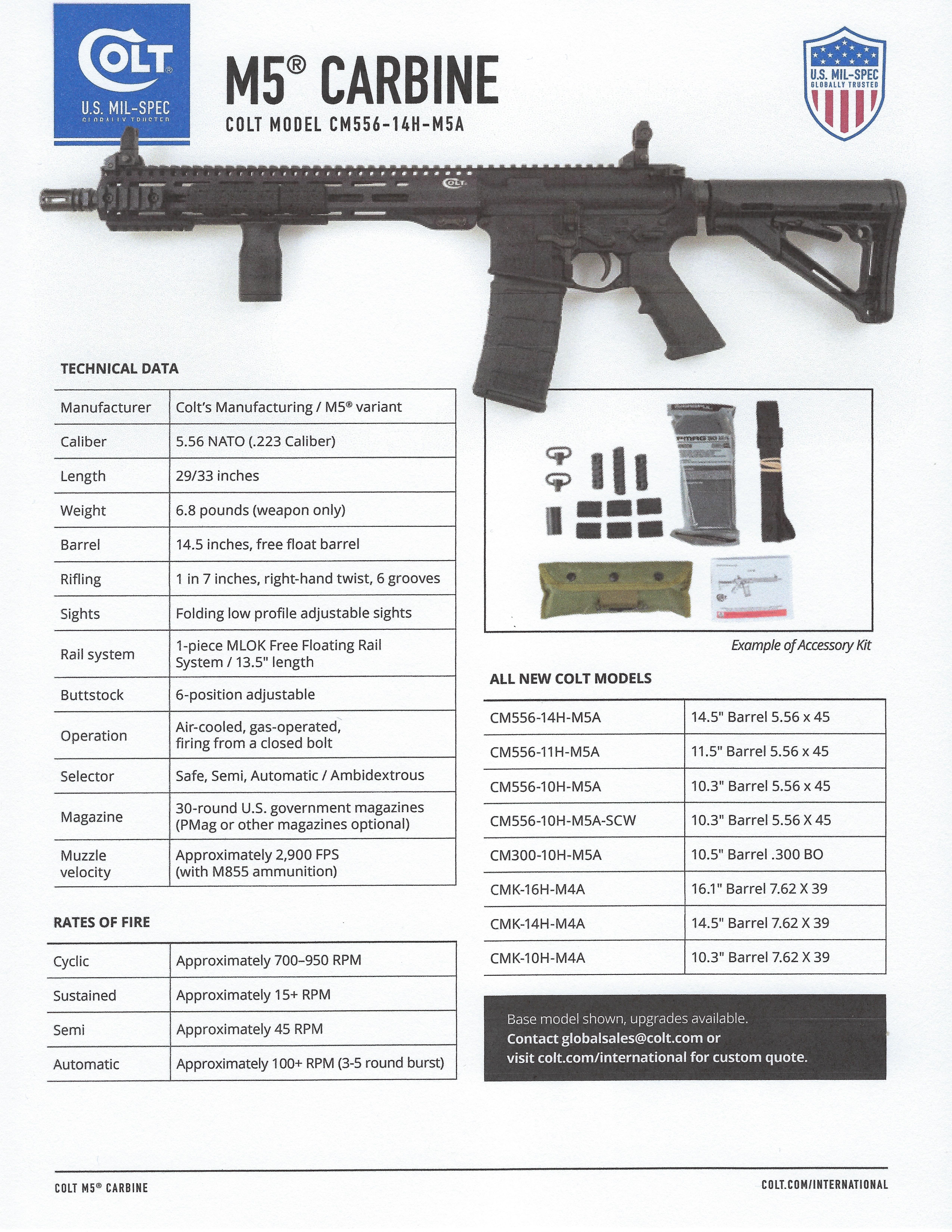 This post is only going to look at the four 5.56mm models. I am going to show you data sheets for three of the four versions and just an image of the fourth variant. The Colt M5 Carbine models are as follows: