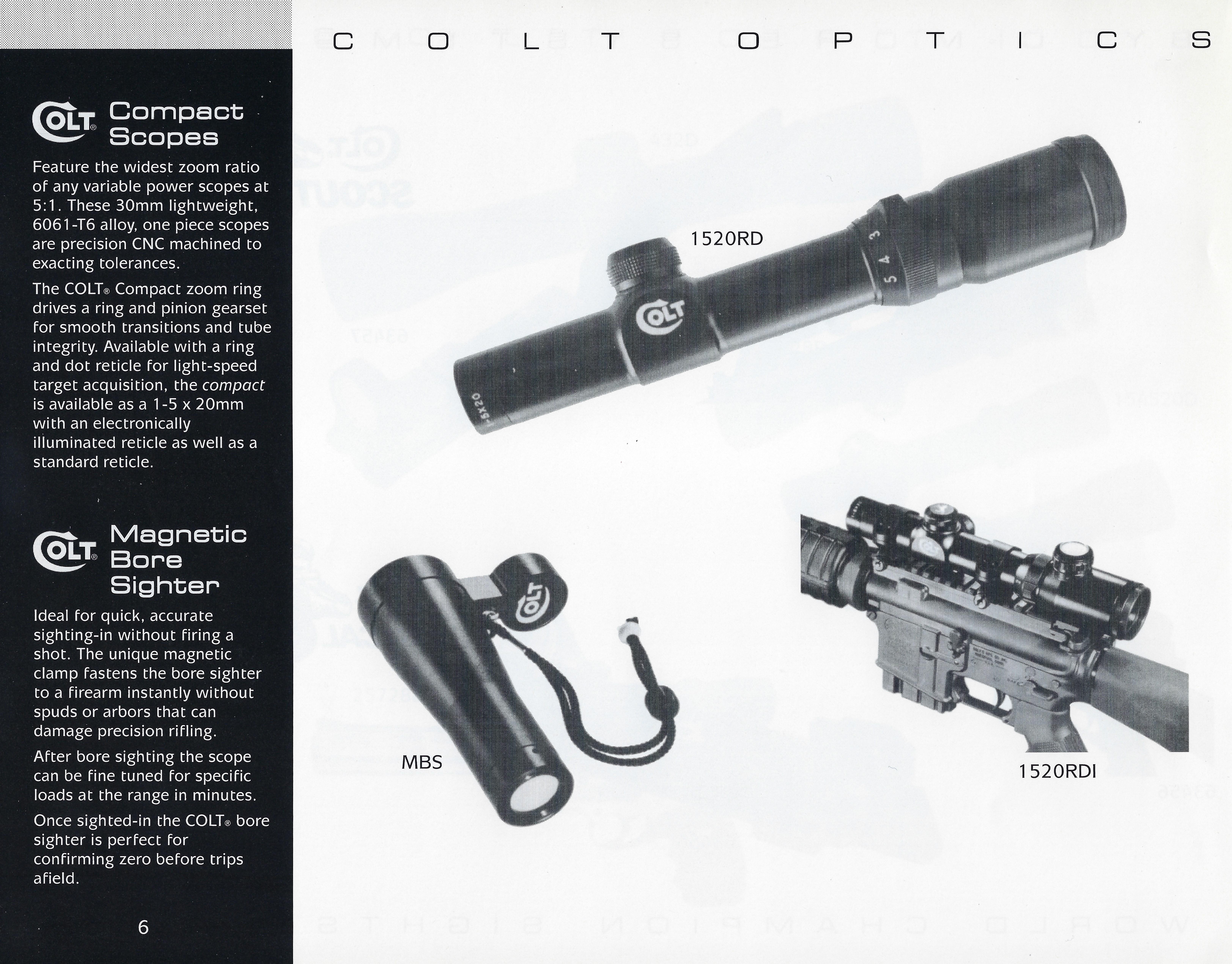 I do have one of the Colt 10×42 Tactical Elite scopes seen on page 3. The owner’s manual in the box is dated with the year 2000 so that gives us a ballpark date I guess.