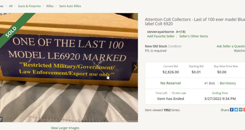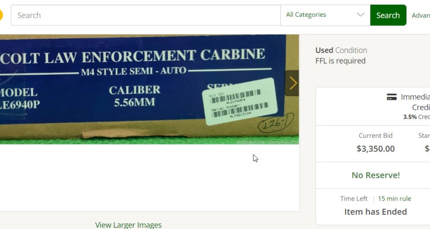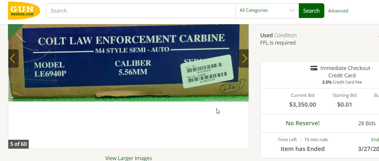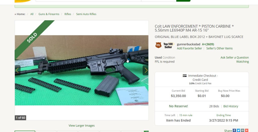 This auction was for a Colt LE6940P carbine that was complete with box/accessories and came from the factory with a ‘Law Enforcement Only’ lower receiver. The closing price was $3350.00.