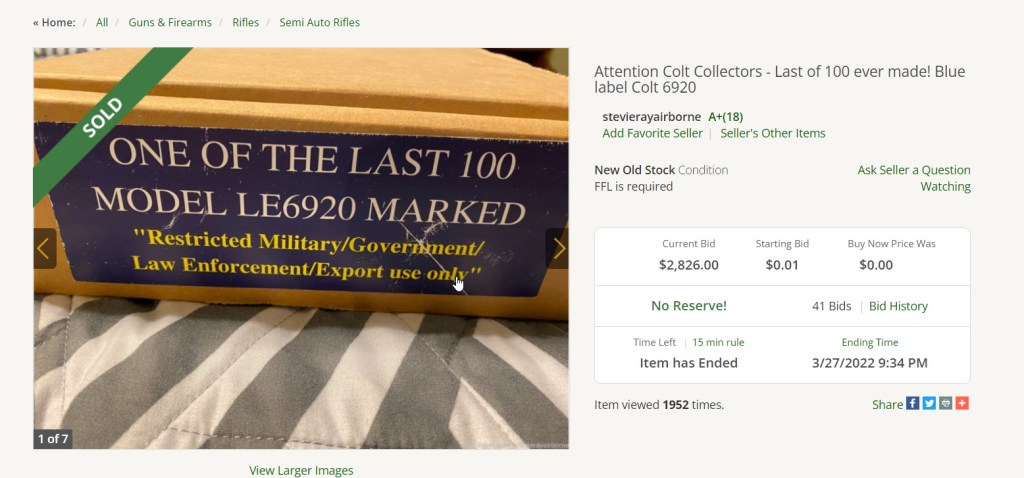 I feel very lucky that I was able to buy a used LE6940P a few years ago although it doesn’t have its box (sadly). People wonder why I buy mostly newer Colt carbines and rifles…prices like this for older examples are why.