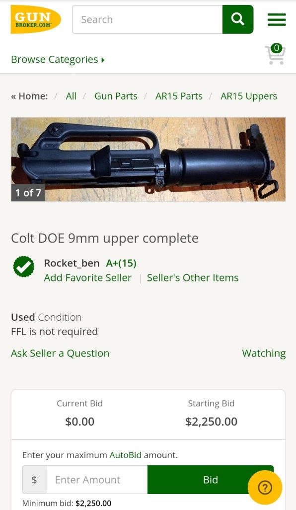 An auction for an actual Colt DOE 9mm SMG upper ended on May 23rd. The starting bid amount was listed as $2,250. The auction did not get any bids.