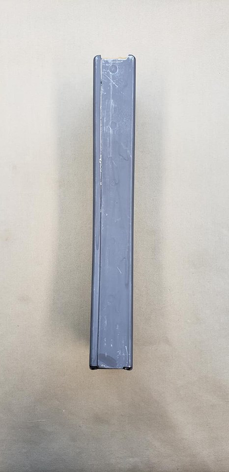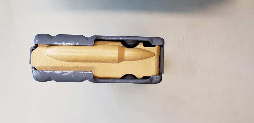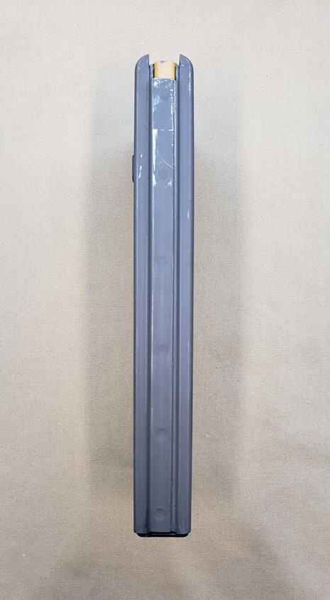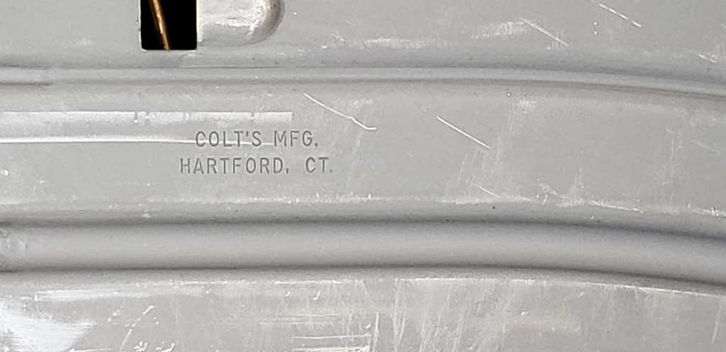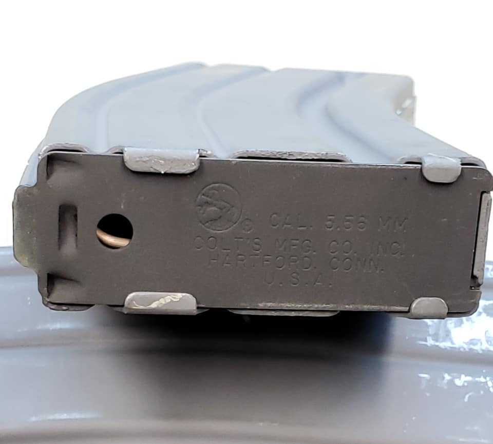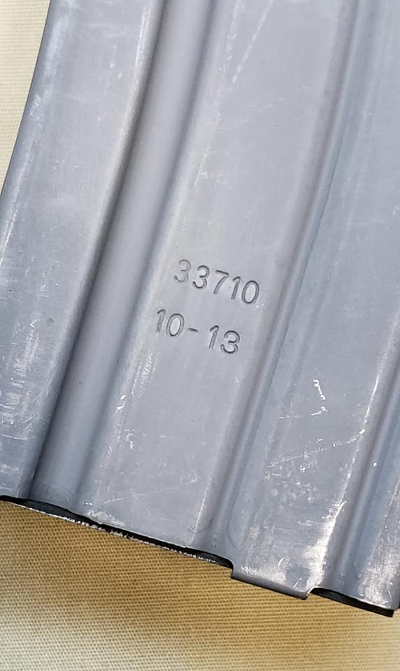 This magazine was advertised by Aim Surplus in February 2019. It was purchased for $15. The magazine is a standard military specification aluminum 30-round magazine with a brown follower. Manufacture date of the magazine is October 2013 as indicated by the date stamp.