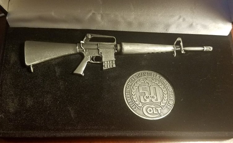 From a private collection…this was a gift to high end customers…diplomats, Generals, etc from Colt. The set consisted of the pewter M16 and the 50th anniversary coin. The set came in a blue felt presentation box which was inside a white box.