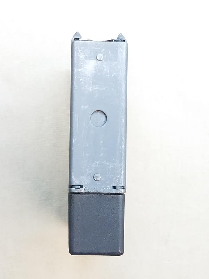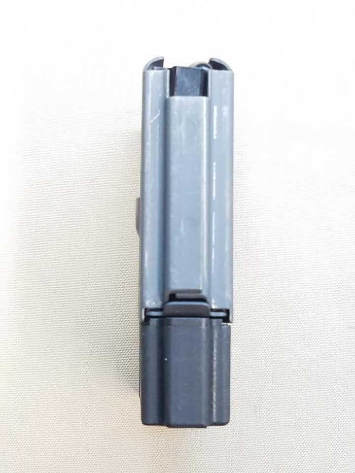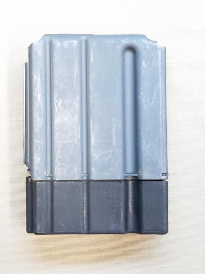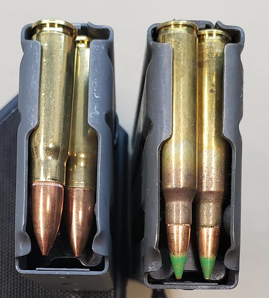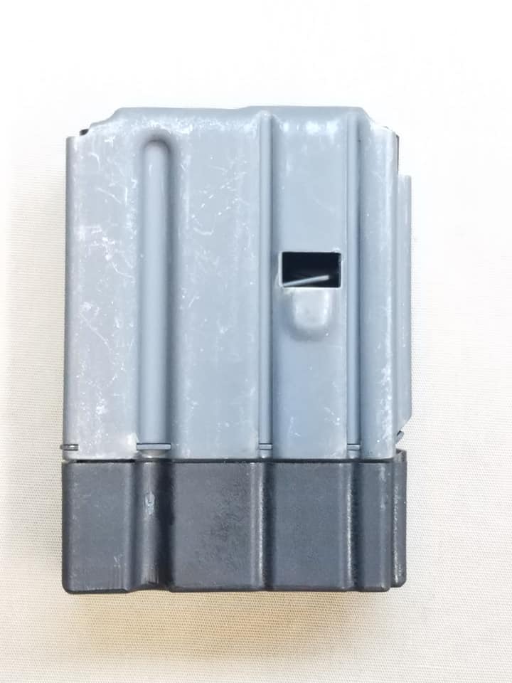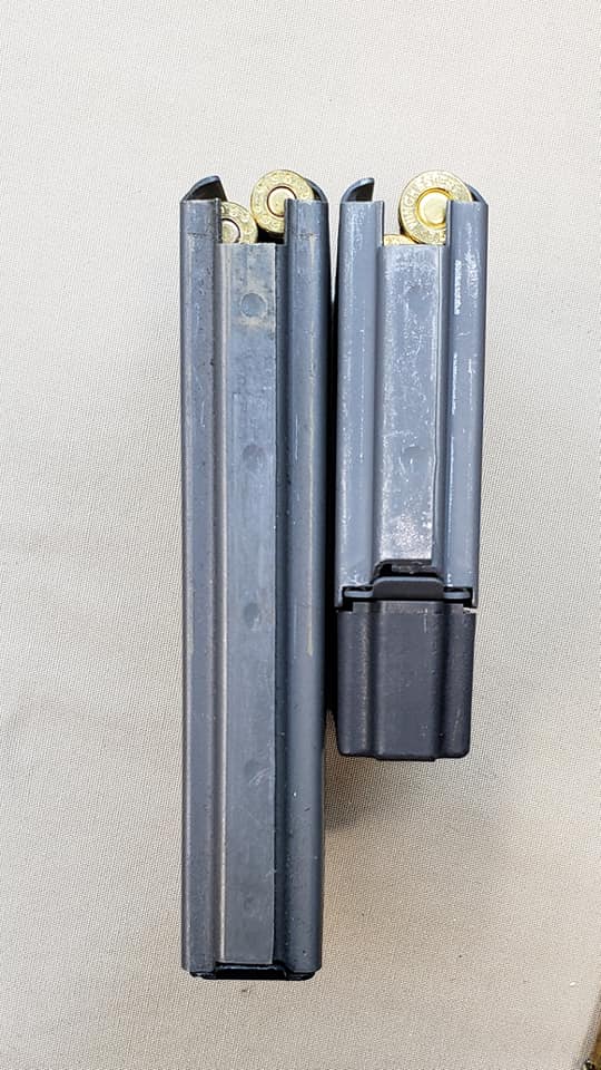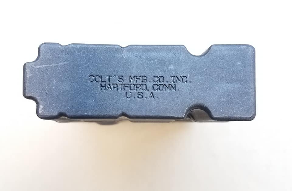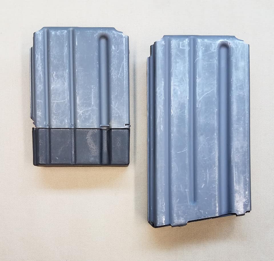These photos show a 5-round Colt factory 7.62x39mm magazine. The white print on the follower is factory applied. Photos show a comparison with a standard 20-round aluminum magazine and 5.56mm ammunition for size comparison.
