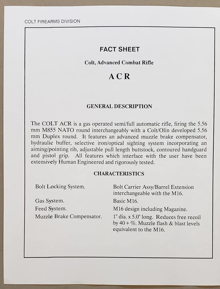 Colt ACR Fact Sheet Share this: Click to share on X (Opens in new window) X Click to share on Facebook (Opens in new window) Facebook More Click to share on Reddit (Opens in new window) Reddit Click to share on Pinterest (Opens in new window) Pinterest Like Loading...