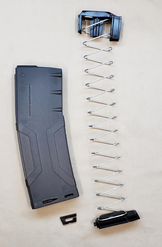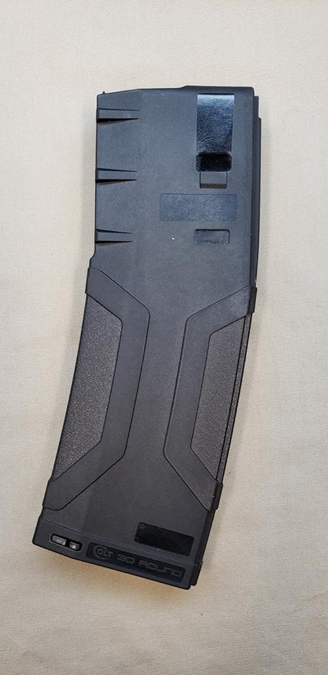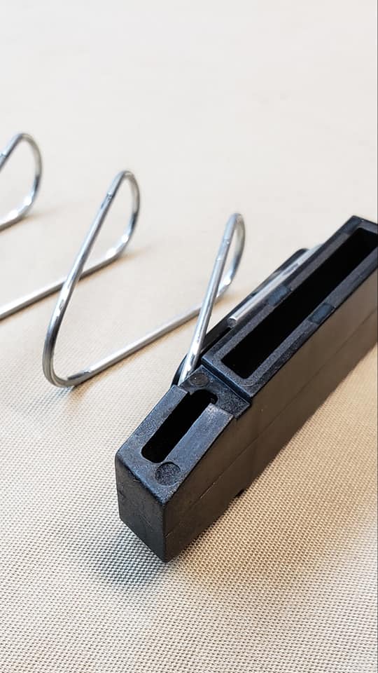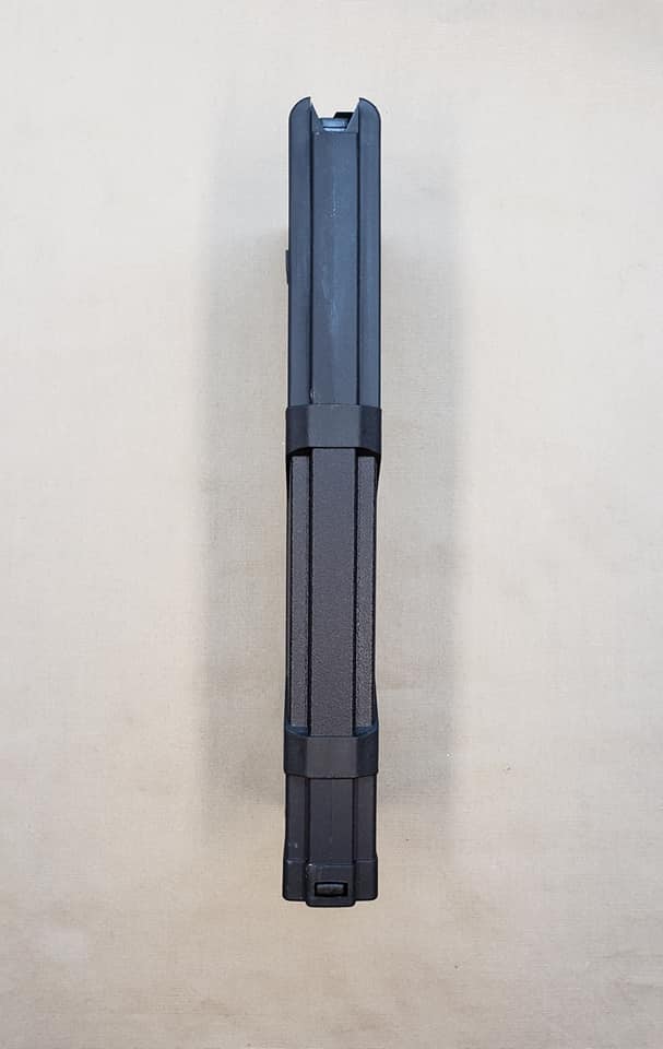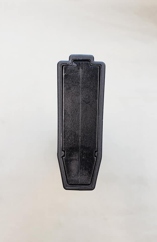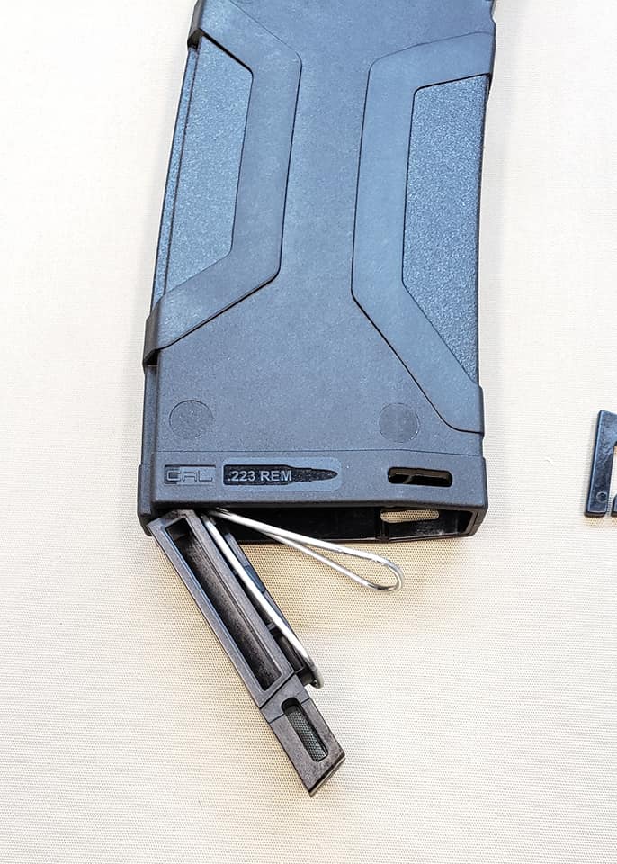 This magazine was purchased for $20 at a gun show in Kansas City in late 2018. This magazine is polymer. Notice the removable locking tab that holds the magazine base in place.