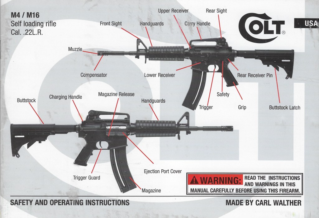 Walther includes a standardized manual (M4/M16 Self-loading rifle cal. .22LR) with the firearms. The manuals are not tailored to each variant.
