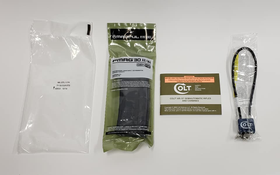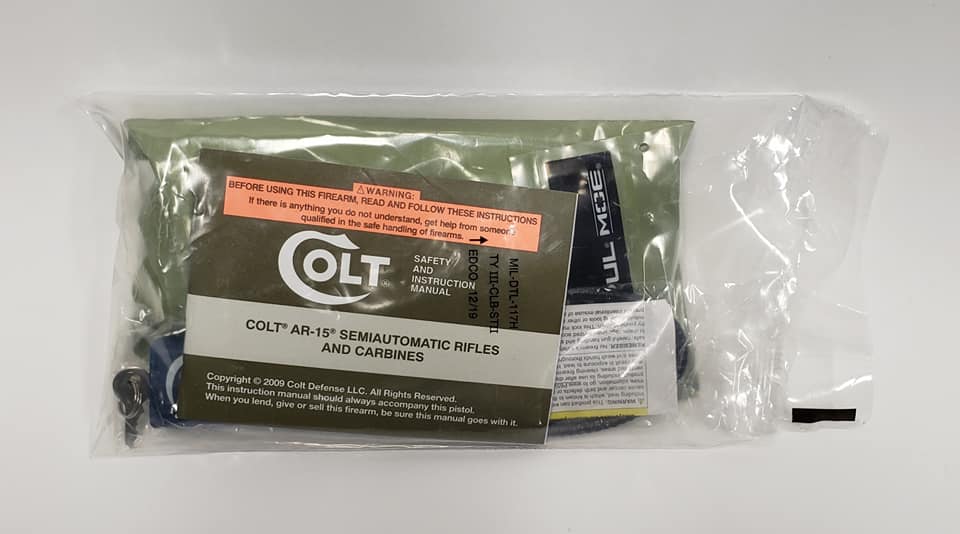 Contained in the open space of the box interior is the accessory package. The accessories are contained in a small (12” x 6”) polyethylene, heat-sealed bag manufactured by Edco Supply Corporation in accordance with the same military specifications as the previously mentioned rifle bag. My accessory bag is dated December 2019. Some people complain that the CR6920’s do not come with many accessories. The CR6920 was intended as an entry level Colt rifle with the expectation that most buyers would change out sights, stocks, grips, etc. With that in mind, there is no point in Colt including accessories that the customer will have to pay for if market evaluation determined that the accessories probably would not be used by the buyer. The more expensive, higher level rifles (CR6920-EPR and CR6940) carbines have additional items included with the rifle with the expectation that much less customization will be done to the rifles by the buyer.