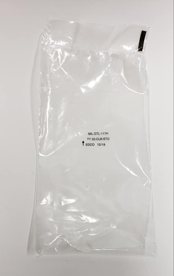 The military specification dictates material, manufacturing and testing requirements for the polyethylene bags. As shown on the bag, the manufacturer is Edco Supply Corporation and the product date is July 2020. The bag is 44” long and 13.75” wide.
