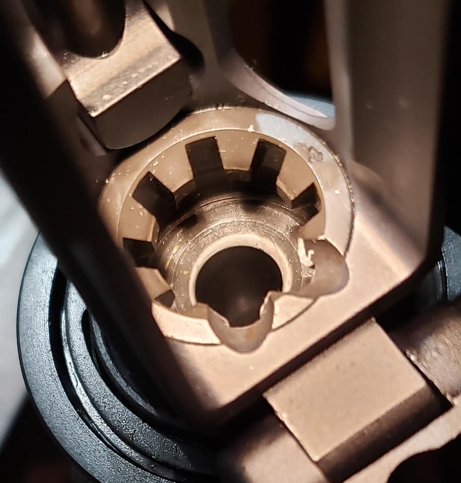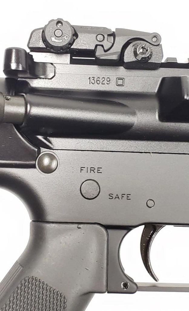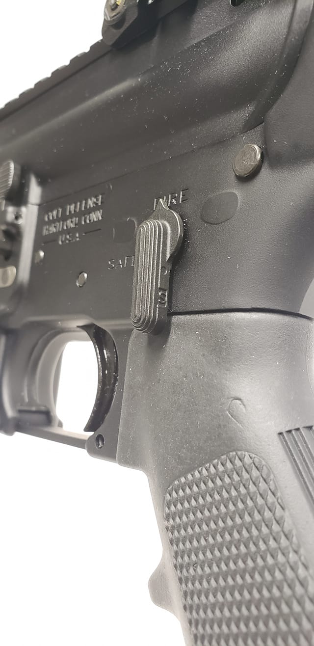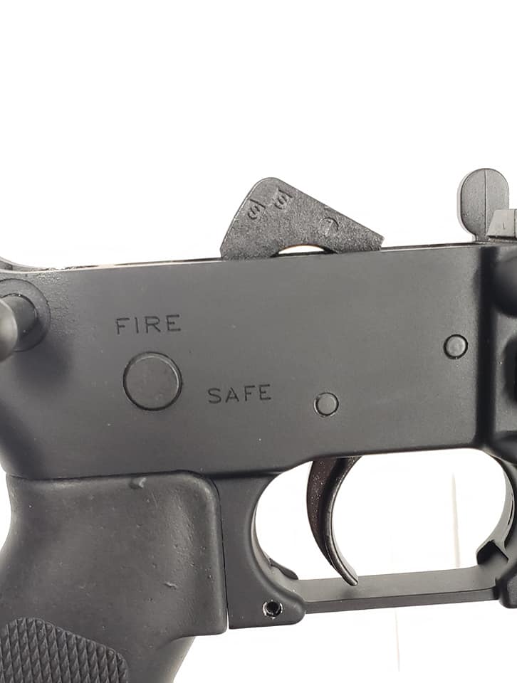 The receiver end plate and castle nut are standard with no noticeable variances. The castle nut and end plate are properly staked. The lower receiver is a standard Colt lower receiver. On the left side, the lever stops are milled off as is done on all civilian rifles. Selector lever markings (SAFE and FIRE) are on both sides of the lower receiver so that the owner can change the side the selector lever is on. The SAFE and FIRE markings appear to be laser engraved. They are clean and uniform in appearance. There is a ‘o’ and an ‘S’ on the selector lever indicating that the manufacturer is Schmid Tool.