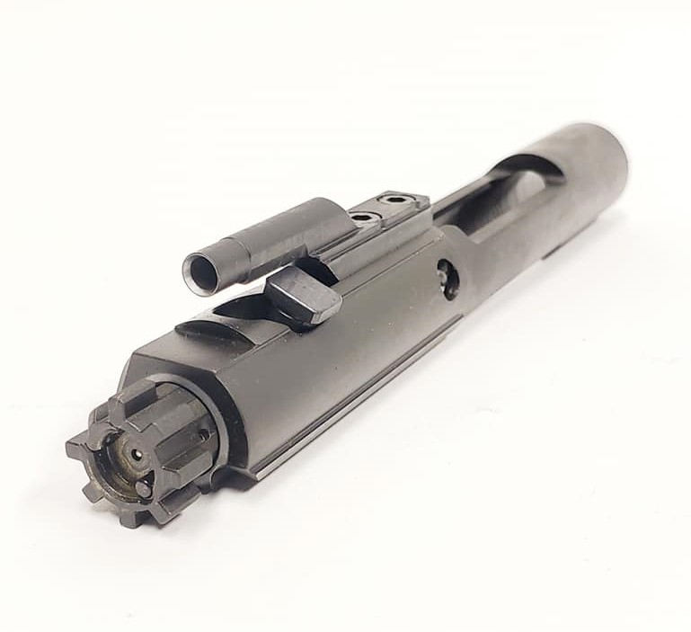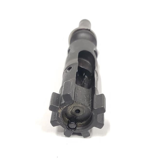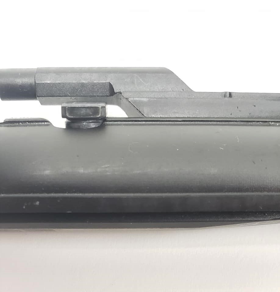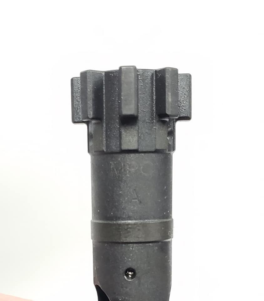The bolt carrier group is a standard Colt full-auto bolt carrier group. A faint ‘C’ has been dot-peened on the left side of the bolt carrier. It is very small and only noticeable under sufficient light and viewed at an angle. The bolt has a faint ‘MPC’ stamped on it. Additionally, there is an ‘A’ stamped on the bolt below the ‘MPC’ which is an indicator for a sub-contractor making the bolts. The staking of the gas key is not as aggressive as I have seen on some of my other Colt rifles but it still meets specifications. The extractor assembly features a copper-colored spring and black insert. The charging handle is standard charging handle with the Colt CAGE code on the bottom.