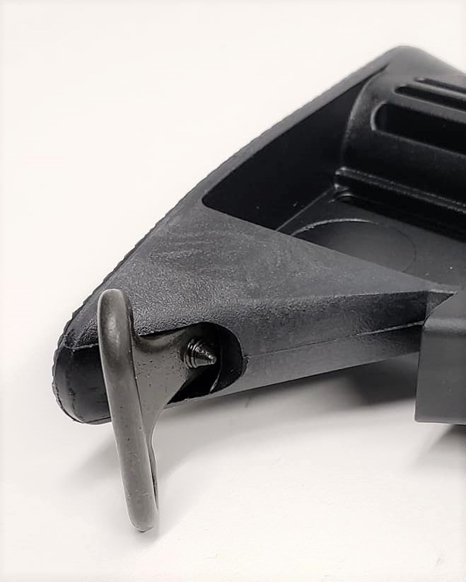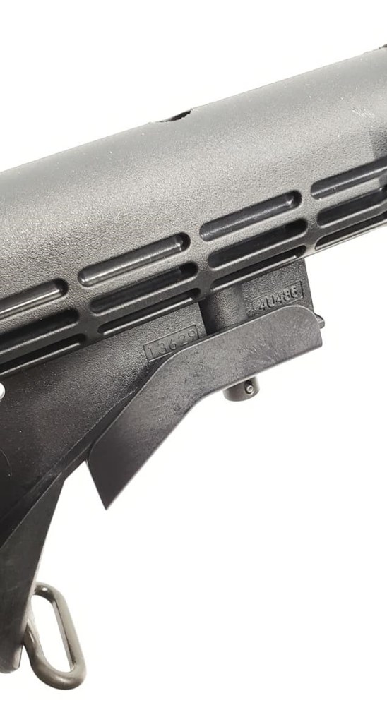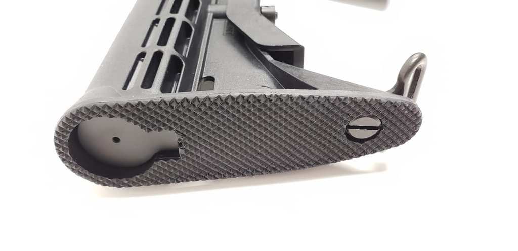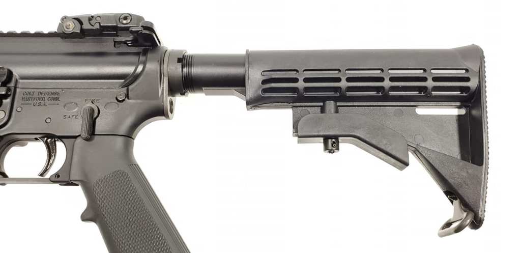 The rifle has a standard 4-position, adjustable buttstock and receiver extension on it. The buttstock is matte black. On the right side of the buttstock behind the locking lever is the Colt CAGE code (13629) and the P&S Products CAGE code (4U486). There is a standard sling loop mounted on the bottom of the stock assembly. It is held in place by a mil-spec screw (identifiable by the pointed end). P&S Products is the manufacturer of this buttstock provides carbine stocks to the DoD in addition to Colt.