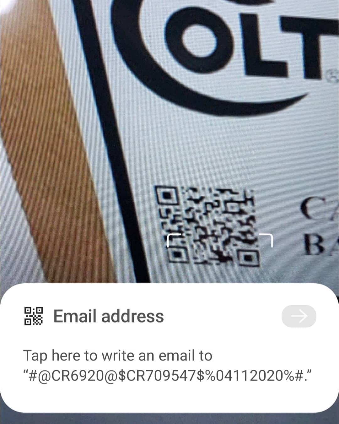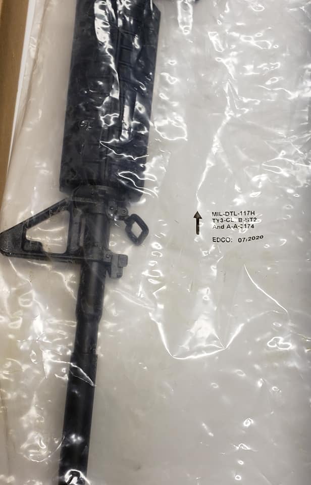 The carbine is contained inside an inner cardboard compartment. On the outside of the inner compartment is a QR code label. The use of QR codes through the manufacturing process gives Colt detailed item tracking from the beginning of manufacturing, through all phases of assembly and final disposition at shipping. The QR code contains the date the firearm began production, the model number and serial number. The carbine is protected during shipment by a clear polyethylene bag that meets military specification MIL-DTL-117, Type 3-Class B Style 2.