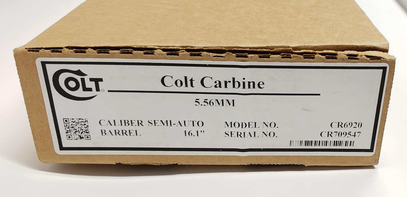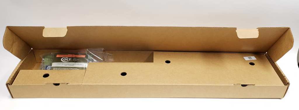 The Colt CR6920 ships in Colts standard compartmented cardboard box (40.5” x 8.5” x 3”) with clamshell type lid. One end of the box has the Colt factory product label that shows the following information: