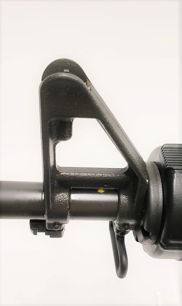 The front sight base/gas block is a standard fixed front sight base/gas block assembly. Some people still ask about why an ‘F’ is no longer put on the front sight base. An ‘F’ is no longer used because there is only one height of front sight base/gas block in use so there is no need to differentiate height variants anymore. My barrel still has a yellow dot present from the quality inspection process that validates gas flow/solvent flow through the gas system. The forge code on the front sight base is very rough. Probably the roughest that I have seen. I am able to tell that it is <B>2. It was extremely hard to photograph. The front sight post is a standard four-sided post adjustable for elevation only. There is a standard sling swivel installed on the bottom of the front sight base/gas block.