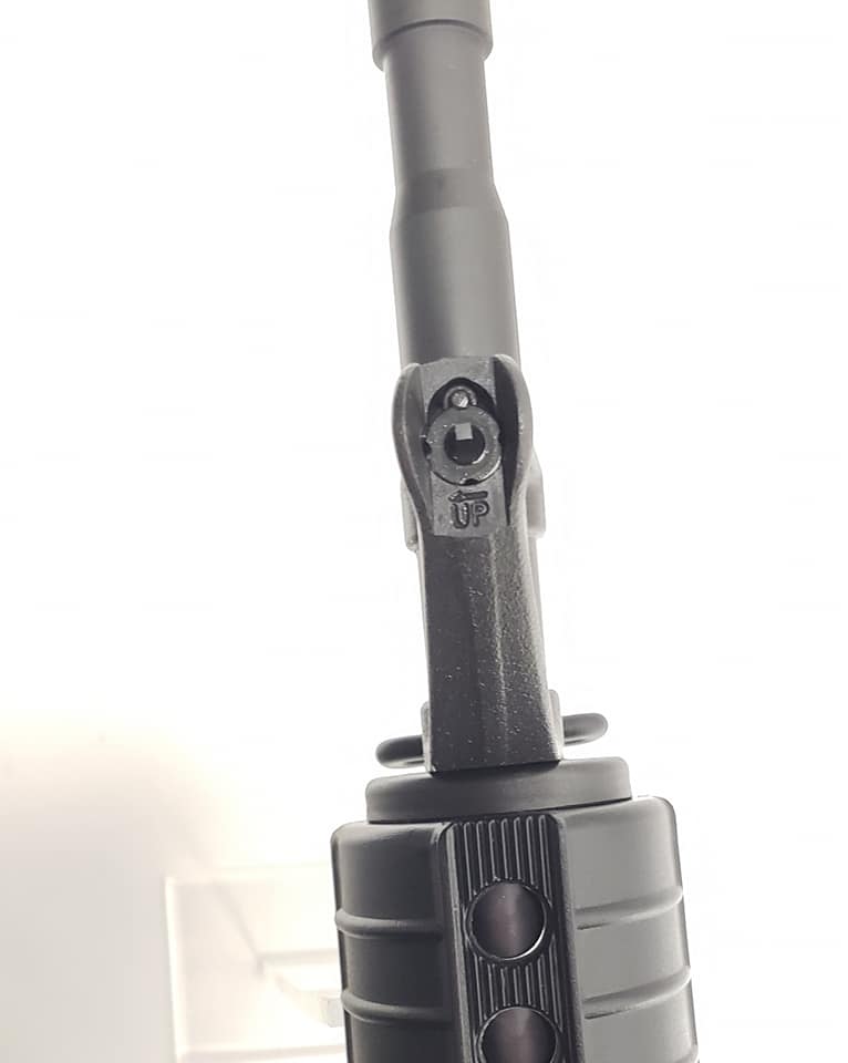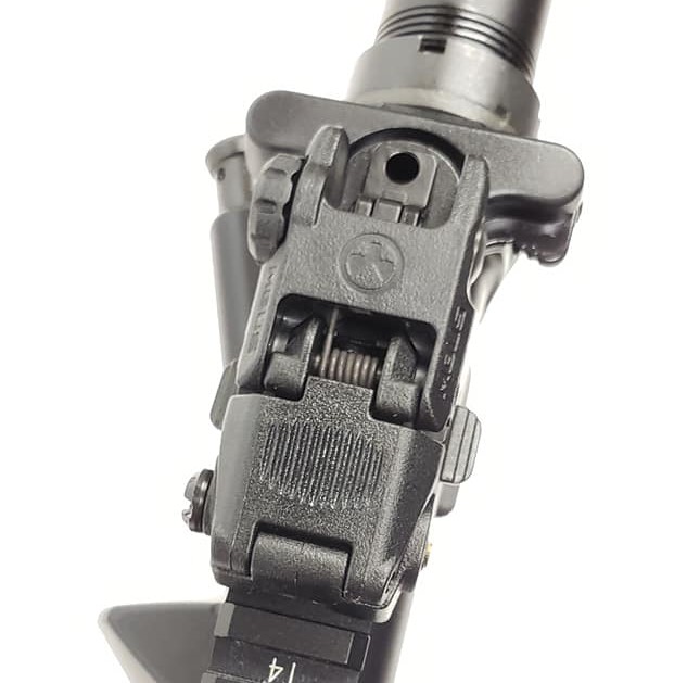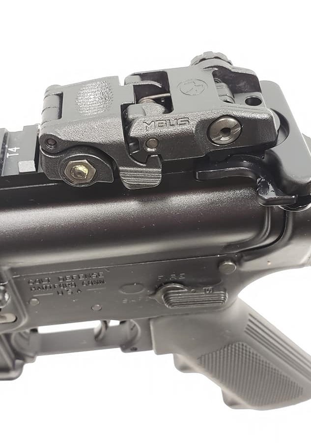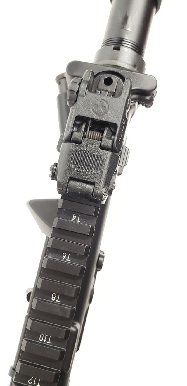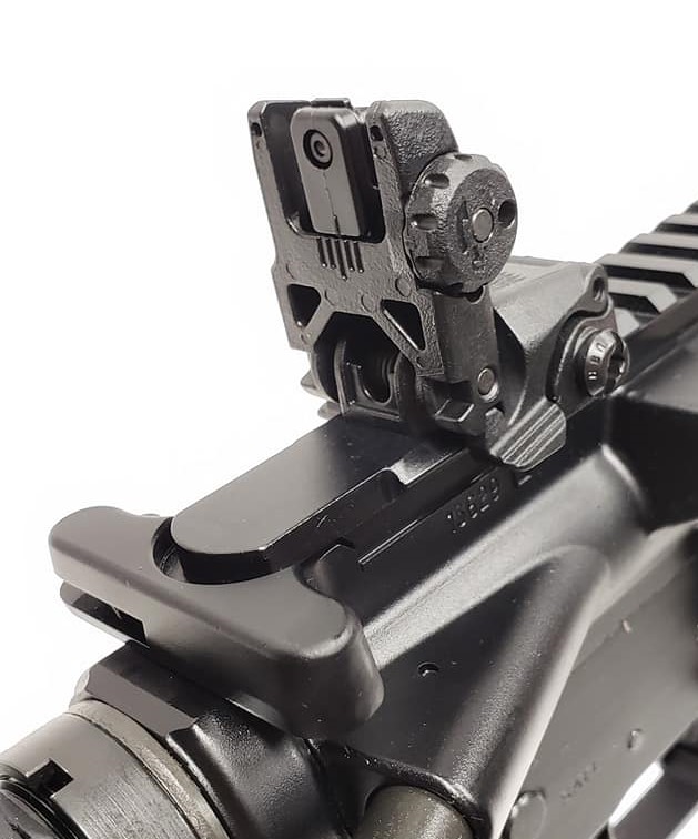 The rear sight provided on the CR6920 is a folding MAGPUL MBUS dual-aperature injection molded sight. The sight locks down in a flat position when not being used. With a slight push on a locking lever the sight body pops up due to being under spring tension. The MAGPUL MBUS sight is adjustable for windage only. If properly installed, the sight mounting hardware aligns with the top rail position T2.