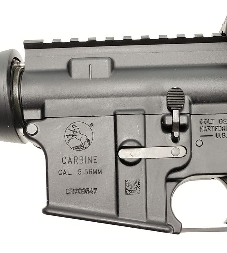 There is a small QR code on the magazine well in line with the relief for the magazine catch. Just forward of the QR code/magazine catch is the rollmark that consists of the Rampant Colt logo and the text CARBINE CAL. 5.56MM. The serial number is etched at the bottom of the rollmark. The rollmark and serial number appear to be laser engraved due to their uniform width and consistent depth of alpha-numeric characters and image outline.