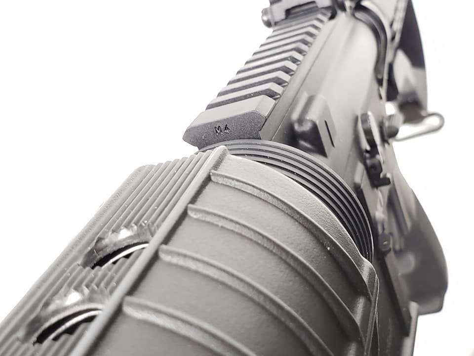 The upper receiver is a standard Colt ‘M4’ marked upper receiver. There are white ‘T’ marks in the even numbered STD-1913 rail positions. The ‘T’ marks on this rifle are of a different font than what I have seen in my other rifles. The white color fill of the alpha-numeric characters is clean and even.