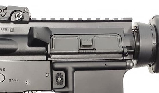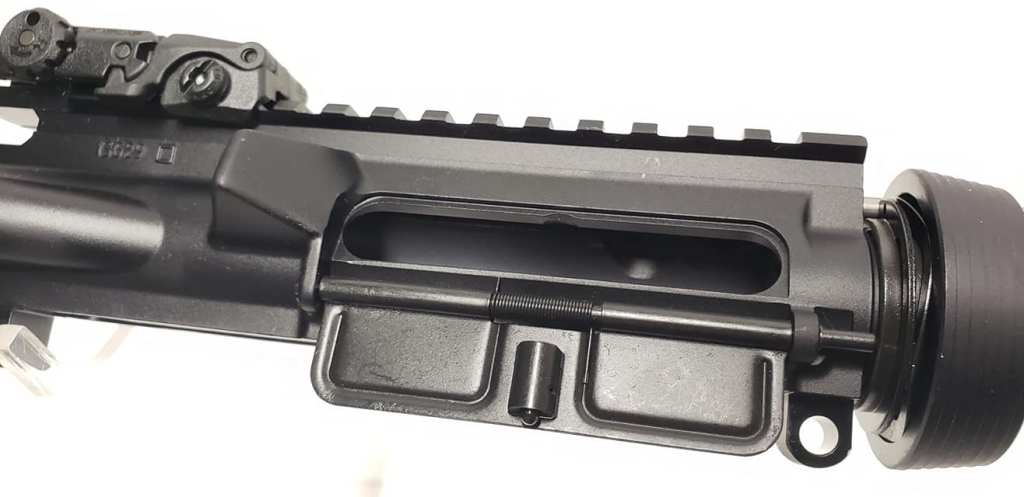 On the right side of the upper receiver is the ‘square’ forge mark that indicates the forging is produced by Brass Aluminum Forging Enterprises of Ferndale, Michigan. The ‘square’ forge is recognized amongst many AR-15 manufacturers and is an industry leader. Just behind the square forge mark is the Colt CAGE code. We see selector marks (safe, fire) on this side. Although the selector lever is installed on the left side of the receiver, it can be changed to the right side. The ejection port cover is standard and uses a black colored spring that blends in with the firearm finish.