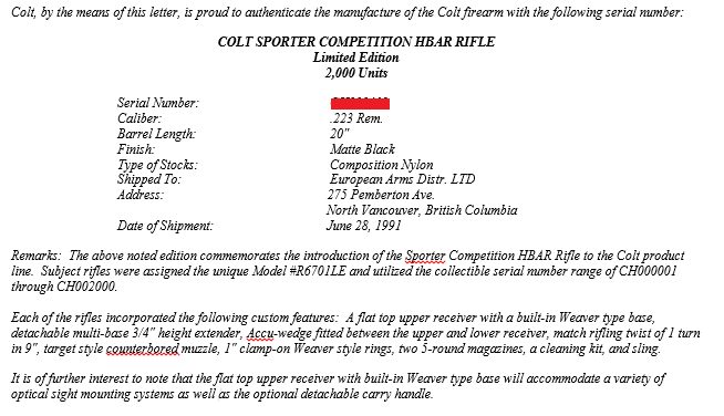 These three images capture a small piece of Colt Custom Shop history with the AR-15. A local friend of mine had this rifle at a gun show in Kansas City in 2019. He is the 2nd owner. Sadly, the original owner changed out everything on the rifle except the lower receiver. The box and the lower is all that is left of the original rifle. However, I think the barrel was probably original. Anyway, I thought I would capture these few images for record along with a generic letter description of what the configuration of the original rifle would have been.