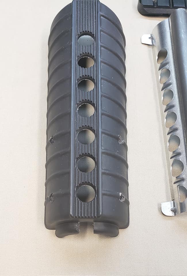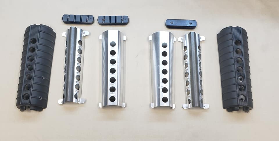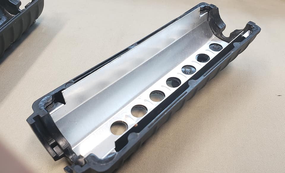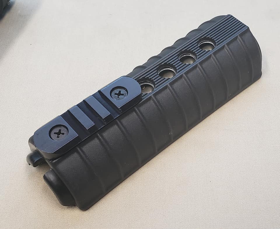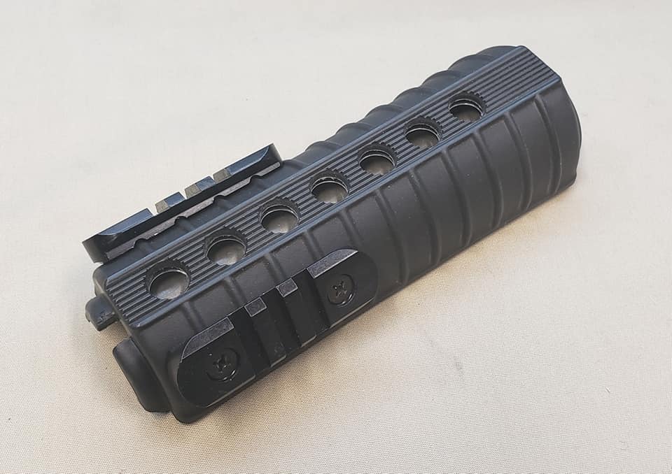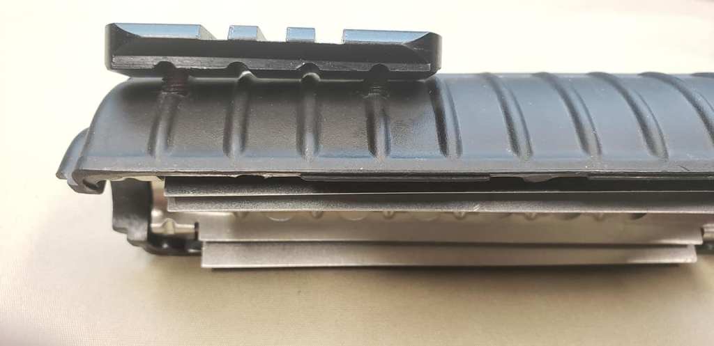 The Y-hand guard system was standard 7-hole carbine hand guards with double heat shields. Holes were drilled in the top section for the mounting of rails. Both the top and bottom rail sections screwed into retaining plates that were glued into the hand guards.
