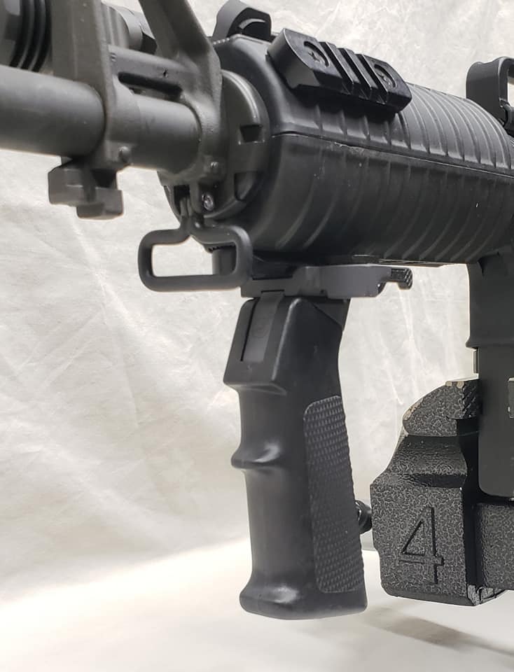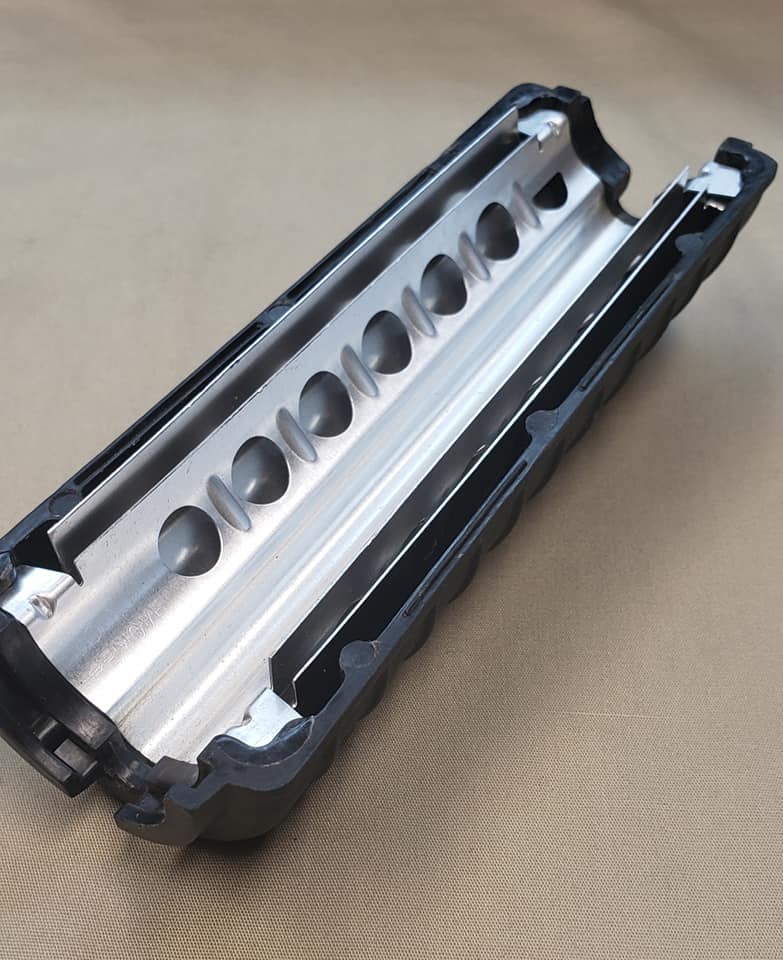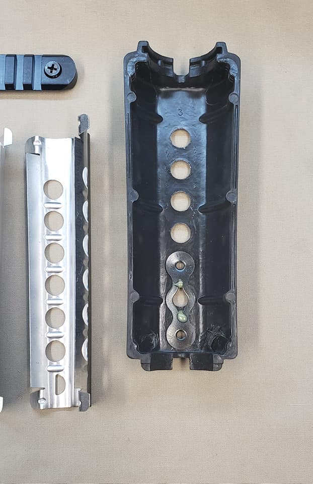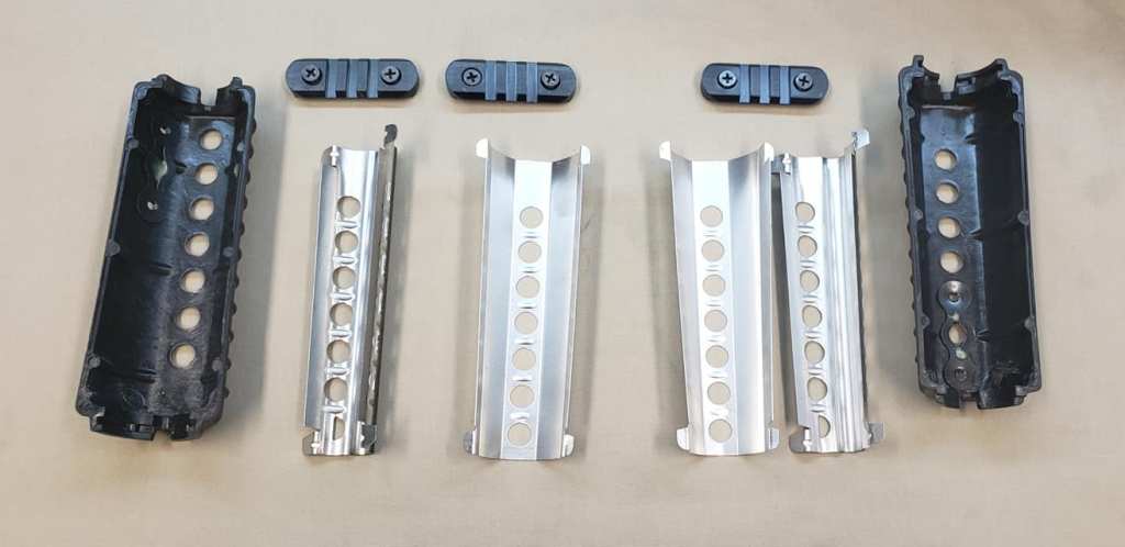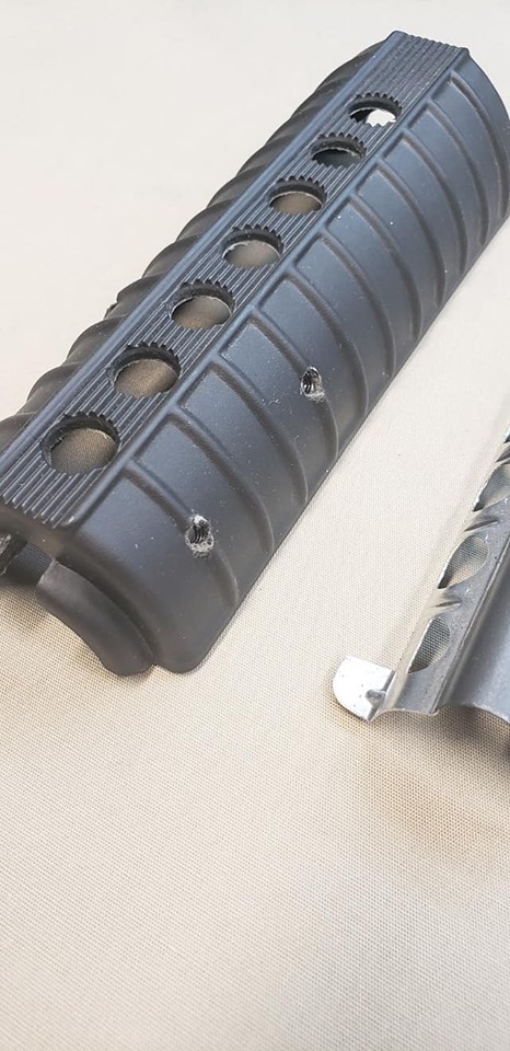 The Y-hand guard system was standard 7-hole carbine hand guards with double heat shields. Holes were drilled in the top section for the mounting of rails. Both the top and bottom rail sections screwed into retaining plates that were glued into the hand guards.